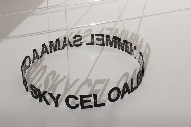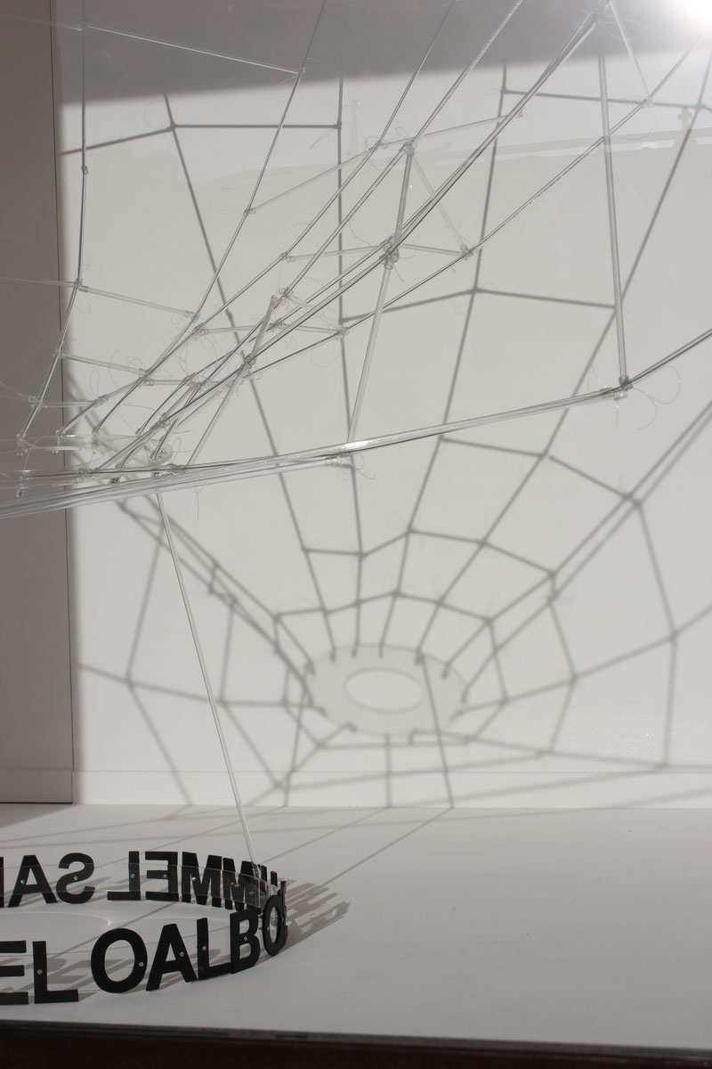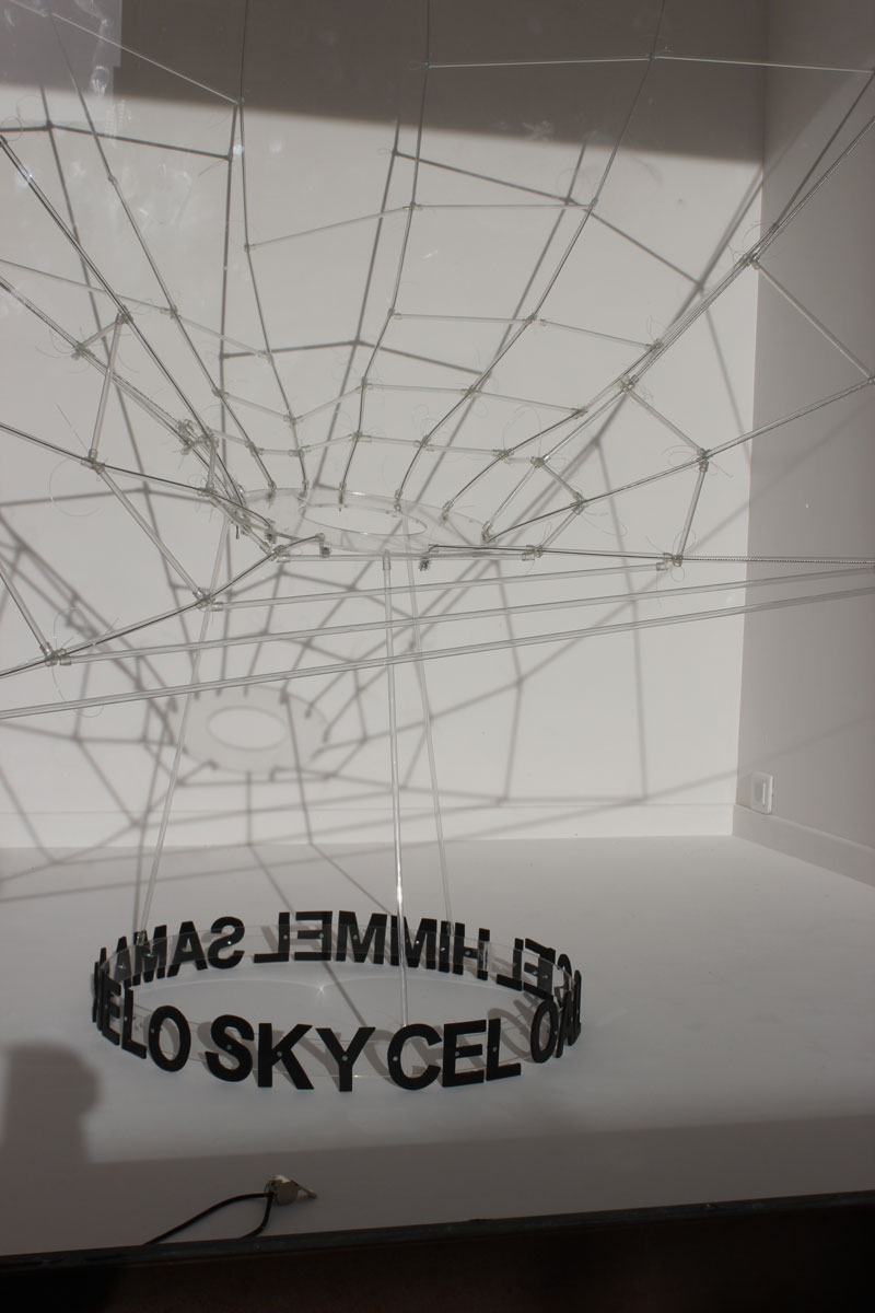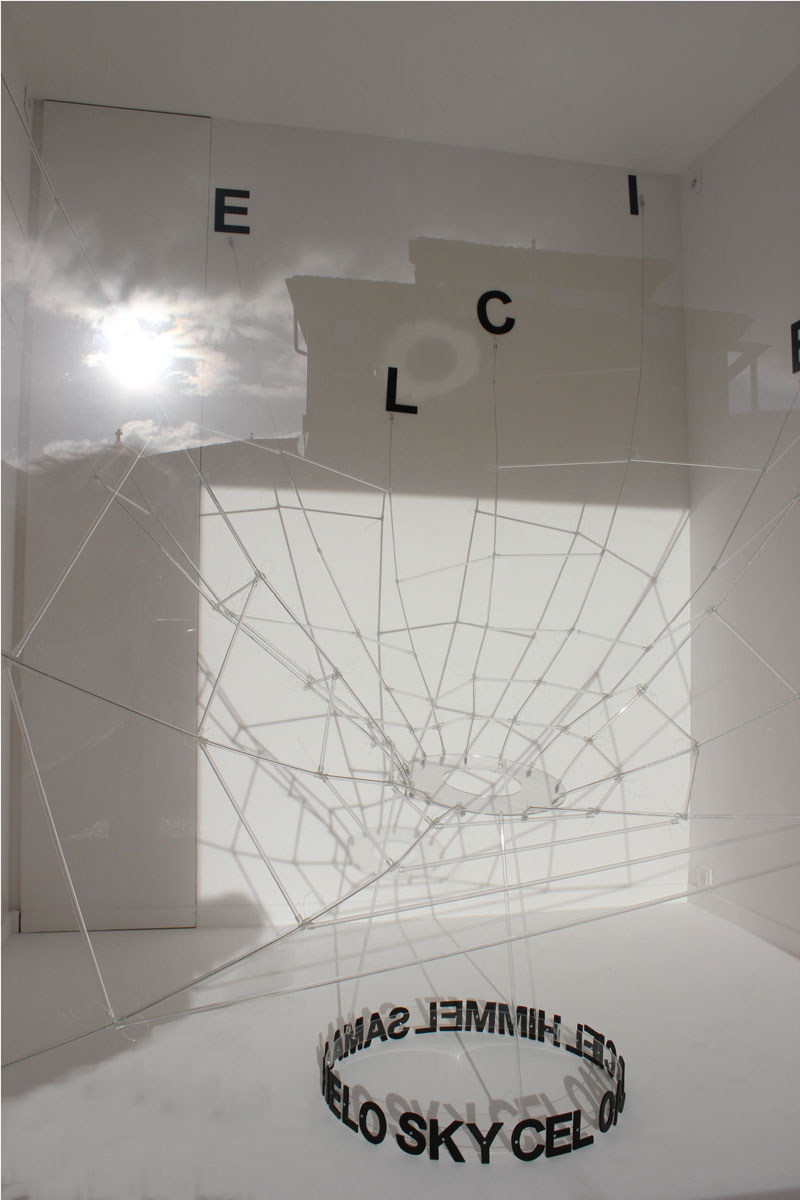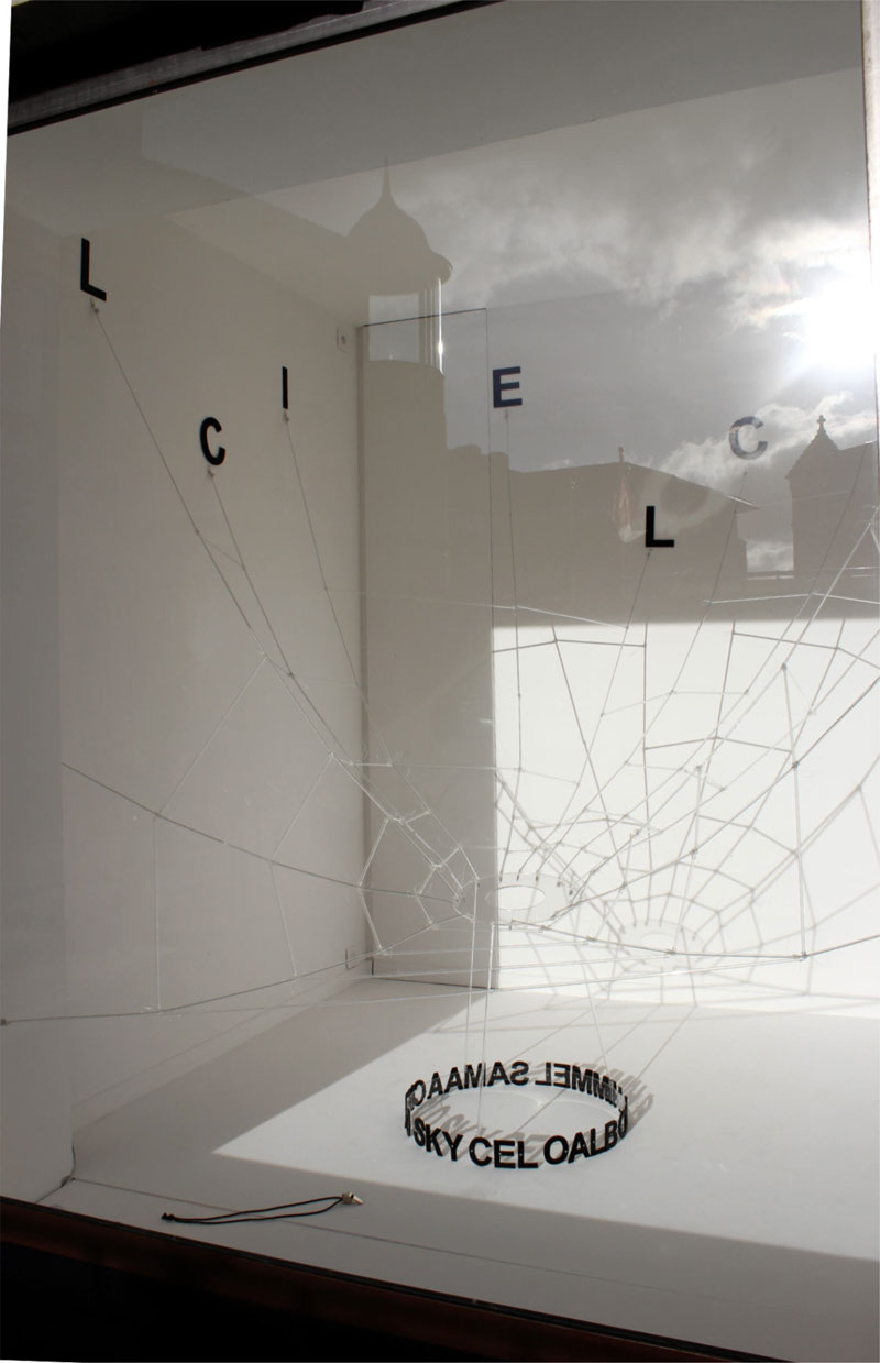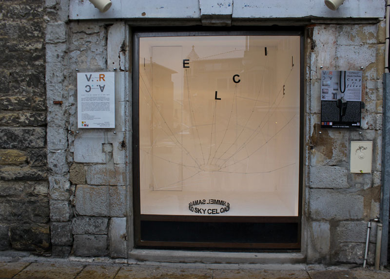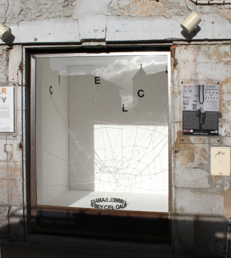 La VRAC, présente une oeuvre inédite de Claude Clarbous mettant en jeu le concept de son travail : le mot ciel. Extraits du texte de Jean Claude Hauc pour l’exposition : « …le mot Ciel n’a chez C. Clarbous aucune connotation métaphysique, mais devient l’agent d’une mise en scène sans cesse renouvelée, modifiée, jouant avec l’espace et la lumière. Le matériau utilisé pour cette construction comme en apesanteur est constitué de tubes de verre, sans rien en eux qui pése ou qui pose. Les ombres portées multiplient l’espace et si le ciel est toujours par dessus les toits, il peut aussi devenir un piège, une polysémie céleste ou l’oeil ségare…..Avec ce coup de filet et cette étrange mise en boîte C.Clarbous entend évoquer plus avant l’humaine condition . La grande toile d’araignée s’étire vers le Ciel éployée et tentaculaire, piège fragile, énigmatique et imprévisible, mais elle s’étrangle ensuite vers le bas se resserre en entonnoir, nasse ou ombilic par lequel l’être doit se faufiler… »