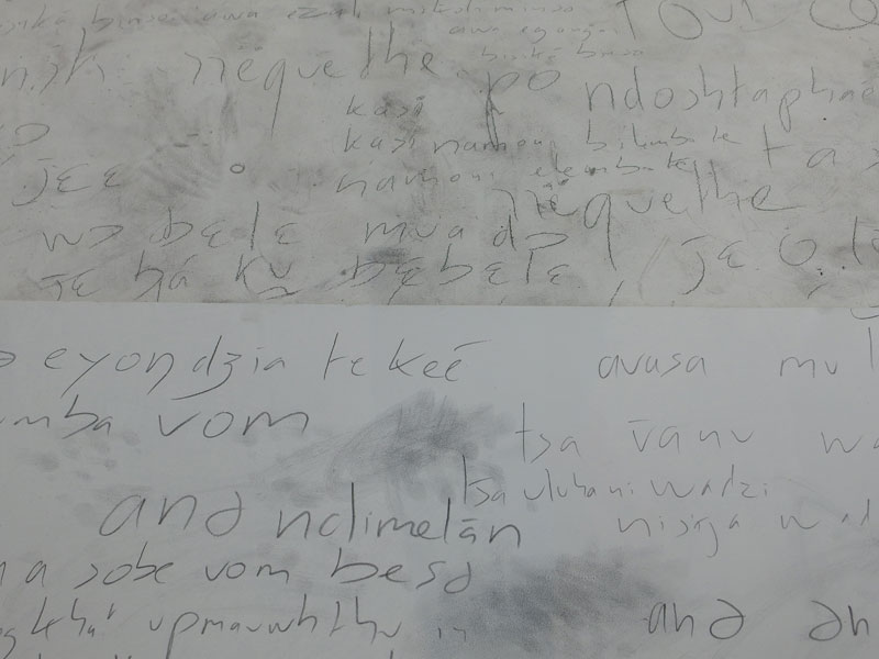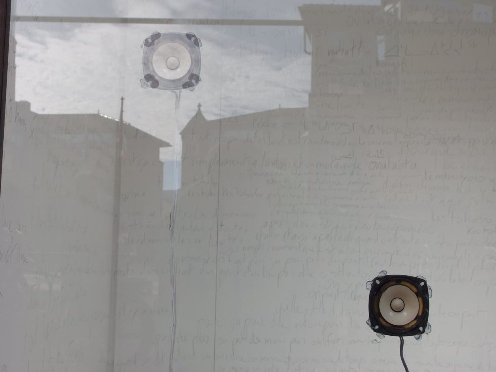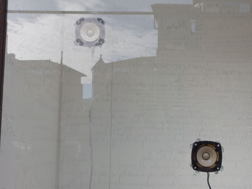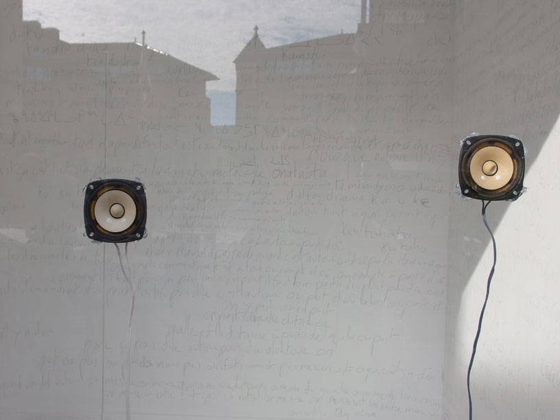 En prenant ce terme comme titre pour l’ensemble de son projet, Frédéric Dumond intègre ces sens du mot — comme peut en témoigner d’une certaine manière la pièce qu’il présente aujourd’hui à la V.r.a.c — tout en lui donnant une dimension plastique, en le déplaçant dans le champ de l’écriture en écrivant un seul poème fragment par fragment, il travaille une forme aux dimensions multiples, une forme sans fin, en perpétuel mouvement : le poème d’il y a quelques mois n’est pas celui d’aujourd’hui ; la glossolalie d’il y a quelques mois n’intégrait pas encore anti-idiome. Un idiome est la langue parlée par une personne. Chacun d’entre nous parle son propre idiome, qui est fait de la langue commune (maternelle) et de la manière dont chacun la comprend, l’invente, la parle. La langue est ainsi autant un moyen de se comprendre que de ne pas se comprendre : « comment saurais-je si ce que je comprends de ce que vous me dites est exactement ce que vous me dites ? » Anti-idiome, comme une partie de « glossolalie », ça n’est pas nier la nécessité de l’idiome, c’est imaginer la langue non pas comme une frontière — l’irréductible frontière ? — mais réunir des langues, y compris mon propre idiome, pour créer une forme ensemble, une forme d’être ensemble.