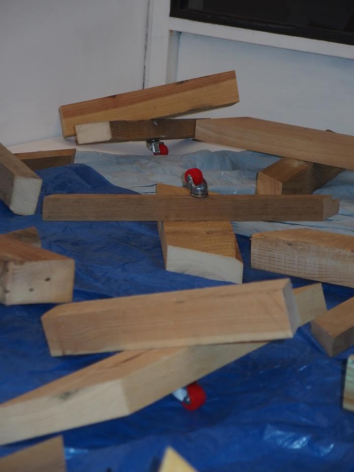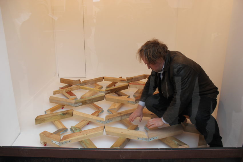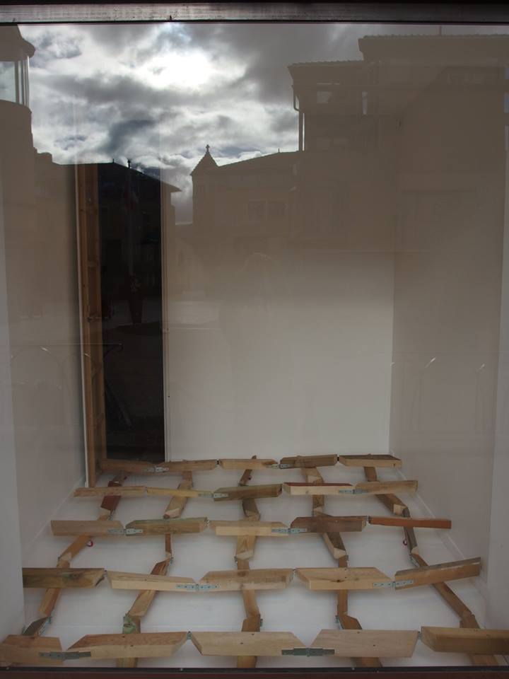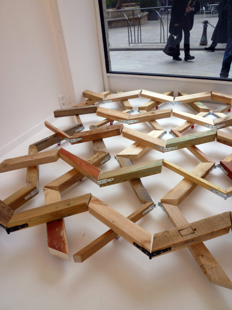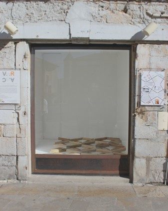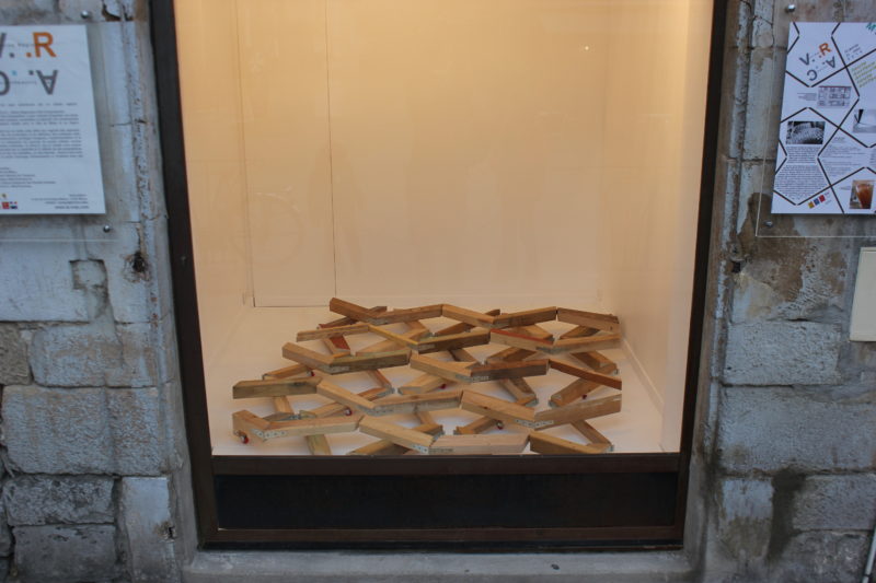 La Vitrine Régionale d’Art Contemporain – la V.R.A.C. – a proposé une oeuvre inédite, d’un artiste vivant et travaillant à Mende. Pour la V.R.A.C. il a réalisé un corps solidaire taillé pour se caler entre les limites tangibles de l’espace d’exposition (les murs) et s’en rétracter. 25 pièces en bois articulées formant une structure qui épouse ou prend l’empreinte de la surface au sol. Au fil de l’exposition, l’oeuvre est déployée, contractée, déplacée, occupant l’espace de différentes manières.