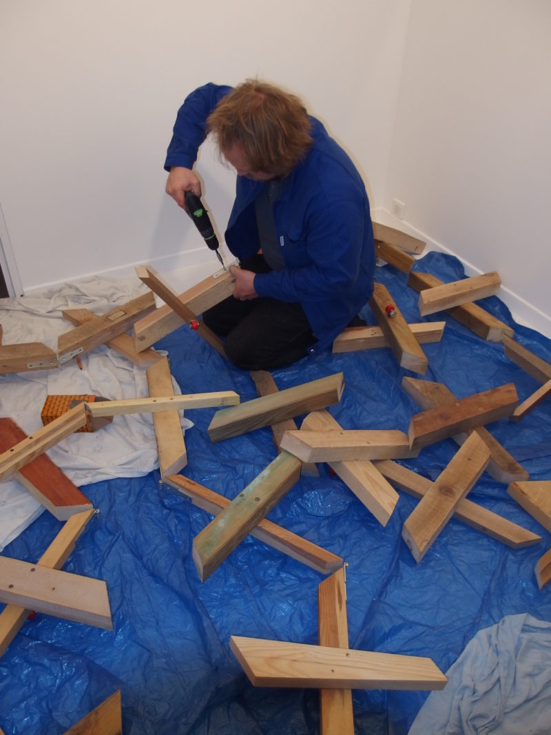 « De moi vous connaissez peut-être – mais pas que – les sangles élastiques croisées à travers un espace donné – atelier, lieu d’expo aussi bien -. Sangles étirées à partir des murs qu’elles mesurent, leur croisement traduit ou exprime un rapport de proportion déjà en marche, mais moins voyant, quand l’espace donné était vide. Le lieu d’accueil a sa part dans ce que le travail a d’unique et de générique. C’est son support toujours visible, toujours utile. Plus généralement je désigne pour un matériau donné un usage strict d’application et d’adaptation aux dimensions, écartements du lieu d’exposition. Que cet usage soit guidé par une règle, une articulation ou une propriété du matériau, j’attends qu’il soit lisible dans le résultat final, attaché à l’idée que toute forme est un processus. En ce sens une forme est toujours animée par l’homme (sic), et ne peut pas être fictive. » Julien Mijangos