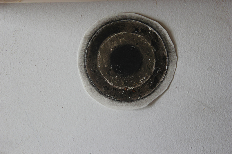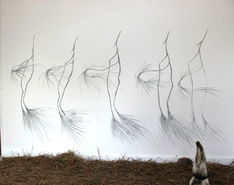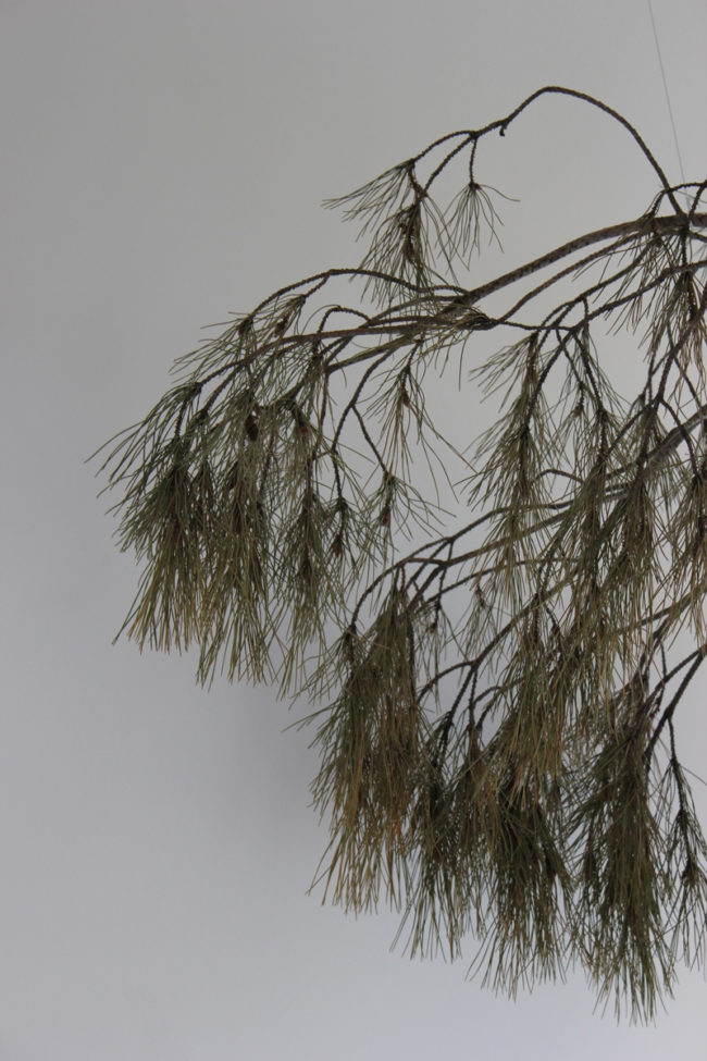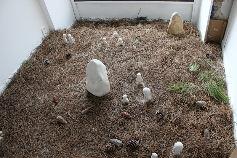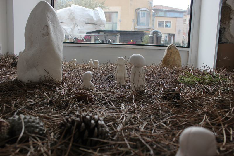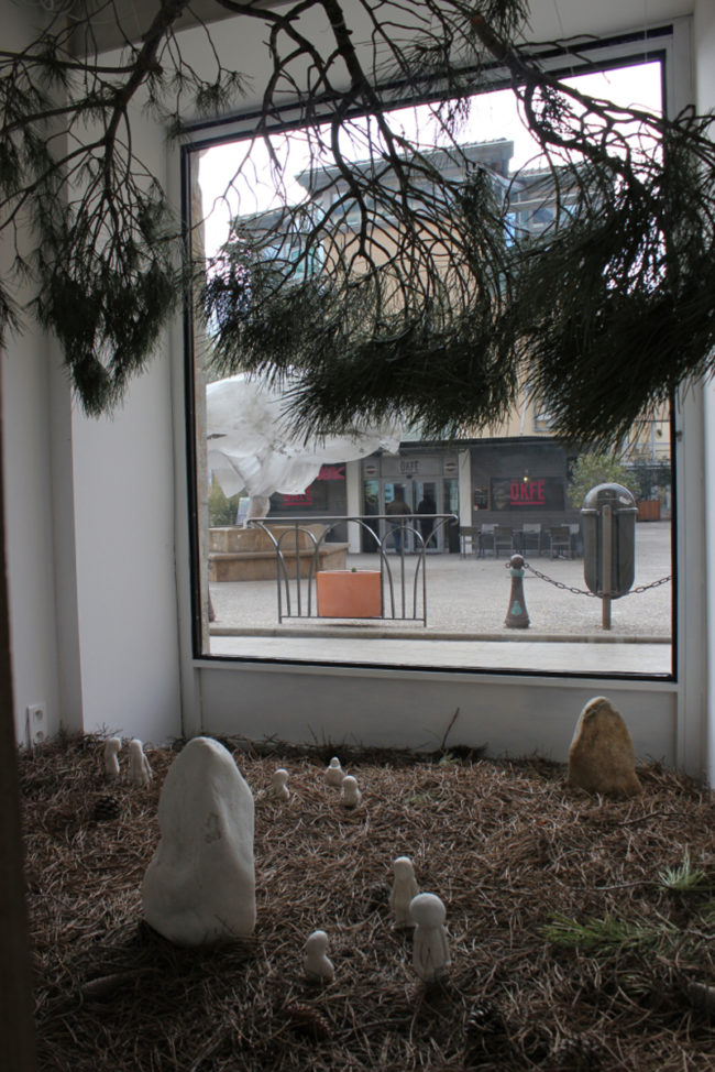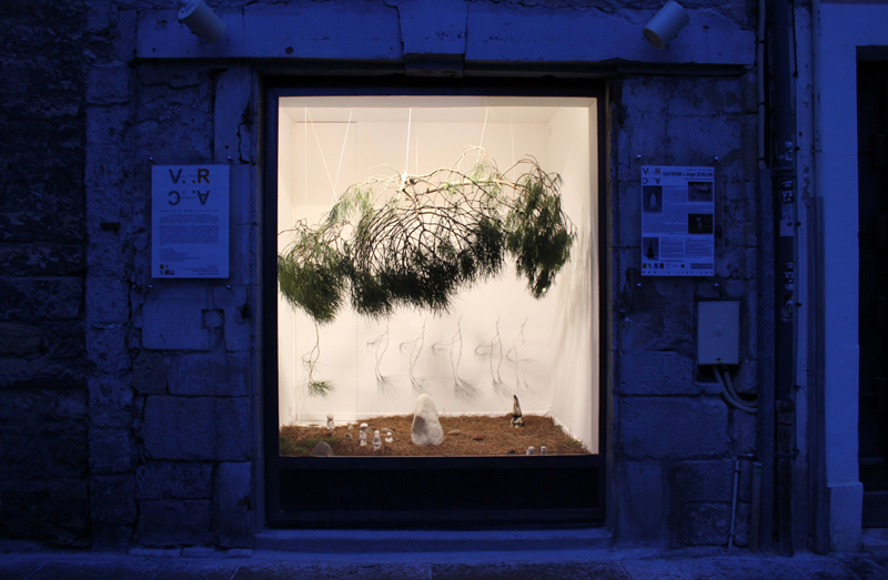 « Est-ce la nature sauvage des Causses qui s’invite dans une vitrine du centre ville de Millau ? Dans ce lieu restreint marqué par sa fonction, soit la présentation de la marchandise, l’idée d’une forêt illimitée et mythique est invoquée, comme sur une scène élisabéthaine, où l’allusion suffit (pour) à situer le jeu. Compte tenu de la fonction première de la vitrine, le projet esthétique proposé ici, que l’on peut qualifier de « dispositif », vacille inéluctablement entre décoration et décors. Les éléments de la « mise en scène » se déploient en une sorte de Kinderspiel, un jeu d’enfants. On trouve-là une pierre anthropomorphe (stèle), le Urgolem (qui ne peut être qu’un Alb, vu les circonstances), les Petits Poucets (les kids de la banlieue qui ont franchi la ligne de ban), la forêt profonde (aiguilles de pin sur le sol, branches de pin, ombres de branches de pin et ombres de branches et d’aiguilles de pin sur la cloison) et une bouche d’écoulement…. » – Cyril Rouge et Jürgen Schilling
