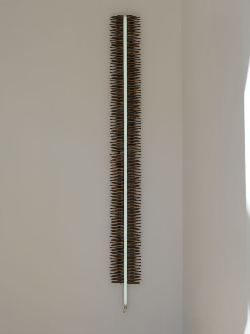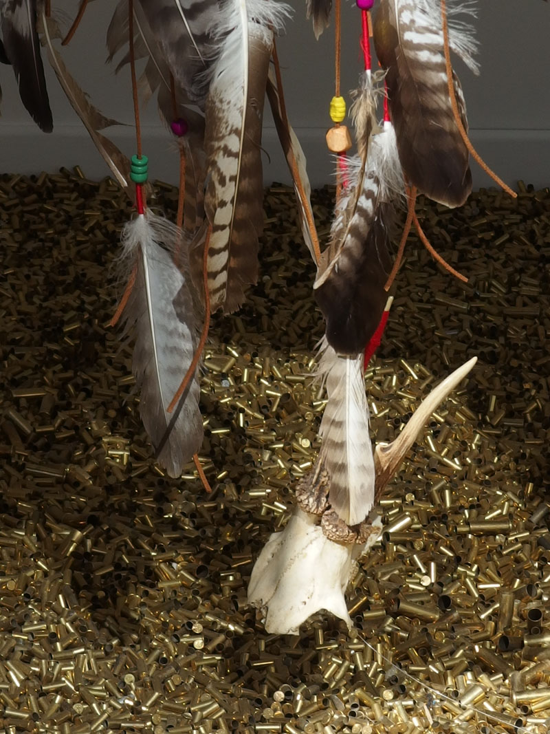 Les œuvres de Léa Le Bricomte opèrent à des croisements de territoires fondamentalement contradictoires. L’opposition guerre-paix y trouve une place majeure en traversant un ensemble d’œuvres où les objets liés au monde guerrier se trouvent affublés d’une autre fonction et par conséquent d’une nouvelle signification. Les munitions aux calibres multiples, les obus de mortier, les fusées éclairantes ou encore les grenades à fusil qui, initialement, avaient une fonction offensive et/ou défensive sont recontextualisés dans un champ ludique, méditatif et altruiste.