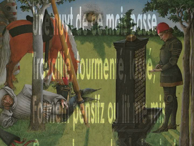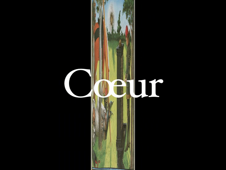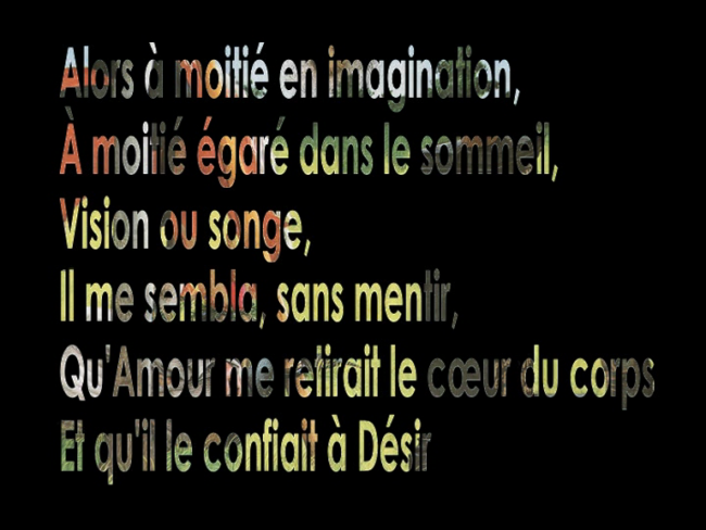 Haïku vidéo, cette proposition évoque la poésie de deux princes du Xvème siècle, René d’Anjou et Charles d’Orléans. Autour des thèmes toujours contemporains de l’amour et de la mélancolie, elle organise avec sobriété une rencontre entre images et textes, animée d’un battement et d’un flux, écho et résonances lointaines et toujours présentes d’un « coeur d’amour épris ».