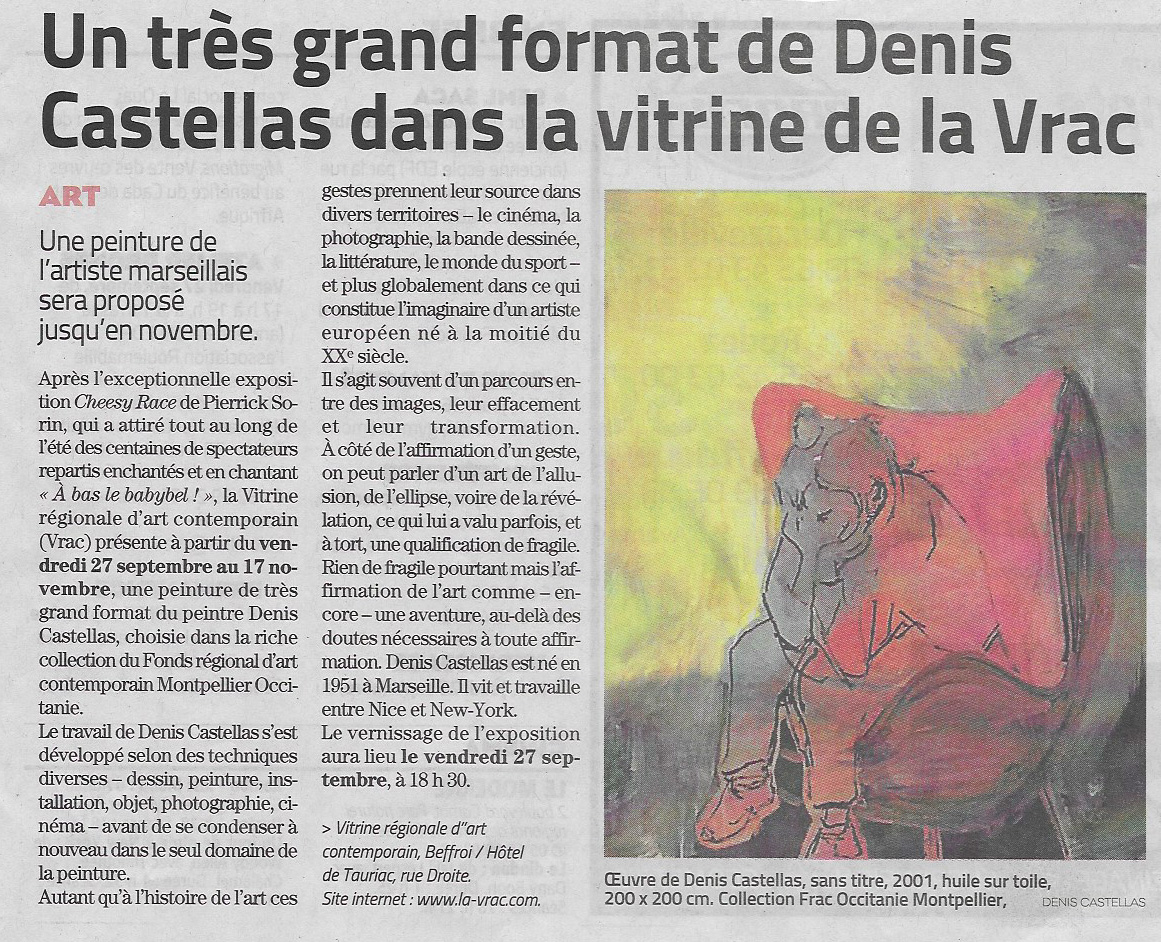 Le travail de Denis Castellas s’est développé selon des techniques diverses – dessin, peinture, installation, objet, photographie, cinéma – avant de se condenser à nouveau dans le seul domaine de la peinture. Autant qu’à l’histoire de l’art ces gestes prennent leur source dans divers territoires – le cinéma, la photographie, la bande dessinée, la littérature, le monde du sport – et plus globalement dans ce qui constitue l’imaginaire d’un artiste européen né à la moitié du XX° siècle. Il s’agit souvent d’un parcours entre des images, leur effacement et leur transformation. À côté de l’affirmation d’un geste, on peut parler d’un art de l’allusion, de l’ellipse, voire de la révélation, ce qui lui a valu parfois, et à tort, une qualification de fragile. Rien de fragile pourtant mais l’affirmation de l’art comme – encore – une aventure, au delà des doutes nécessaires à toute affirmation.