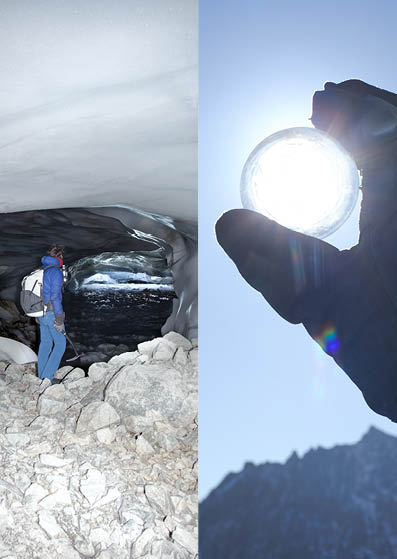 Avec LAST IMAGE, Julien Sales réalise un travail chronophage et périlleux. L’artiste descend dans les crevasses des glaciers afin de récupérer une matière qui le fascine: des blocs de glace totalements transparents. Il les transforme ensuite en objectifs d’appareils photo, directement sur la montagne, via une série de moules. Ces lentilles sont porteuses de l’histoire géologique du glacier et demeurent à la fois vivantes et éphémères. Cette étrange caméra, qui hybride numérique et minéral, photographie à travers et par le glacier lui-même : la lumière qui traverse la lentille, traverse littéralement l’histoire du glacier. Cette caméra-glacier devient alors le dernier témoin de sa propre disparition. Les images obtenues sont très picturales, imparfaites et changeantes — une représentation vivante de la montagne.